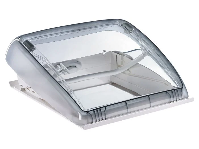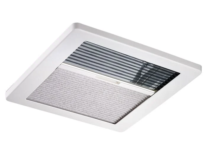 Wir entscheiden uns also für das Dometic Mini Heki Style Fenster in 40x40cm ohne Zwangsbelüftung. Am Innenrahmen sind ein Verdunkelungsrollo und ein Fliegengitter befestigt und die Kuppel mit doppelter Acryl-Verglasung kann mit einem Handbügel in drei verschiedenen Positionen aufgestellt werden (inkl. Schlechtwetterposition).