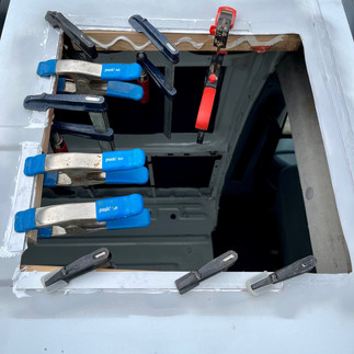 Als erstes werden nun die Aluleisten in die Sicken geklebt und mit Schraubzwingen befestigt. 🗜️ Die müssen dann nämlich erstmal trocknen.