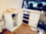 Kallax passt und es wird über Eck gebaut, der Kühlschrank per Holzkonstruktion hochgebockt und sogar unsere beiden Wasserkanister für Frisch- und Abwasser passen ziemlich genau in einen weiteren Kallaxrahmen. Hierfür wird also kein Holzrahmen benötigt, ein Arbeitsschritt gespart 😁